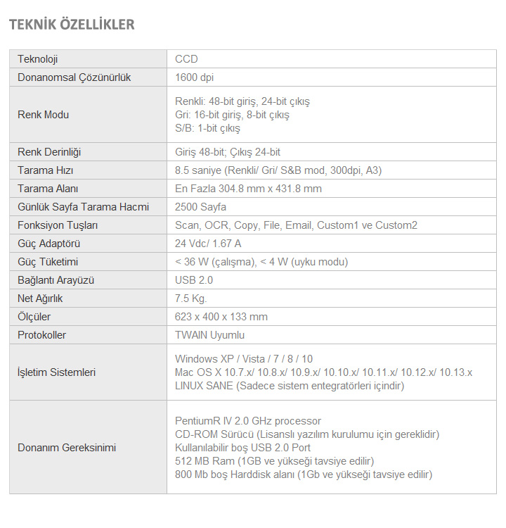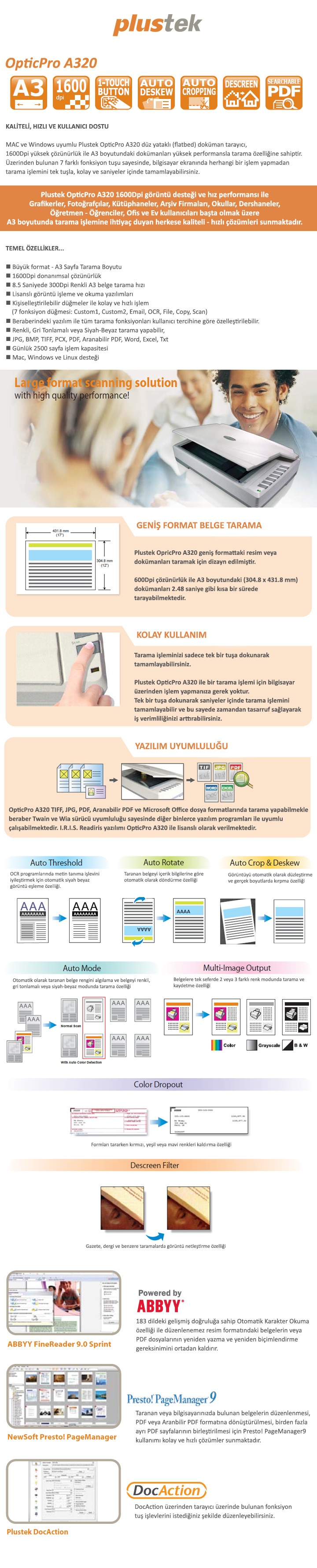 Plustek OpticPro A320, 8.5 saniyede 300Dpi ile A3 boyutlu belge tarama özelliğine sahip düz yataklı (flatbed) tarayıcıdır. 7 farklı fonksiyonları düzenlenebilir akıllı tarama butonları, beraberinde gelen güçlü doküman düzenleme yazılımları ve günlük 2500 sayfa işlem hacmi ile kullanıcılarına kaliteli tarama çözümleri sunar.