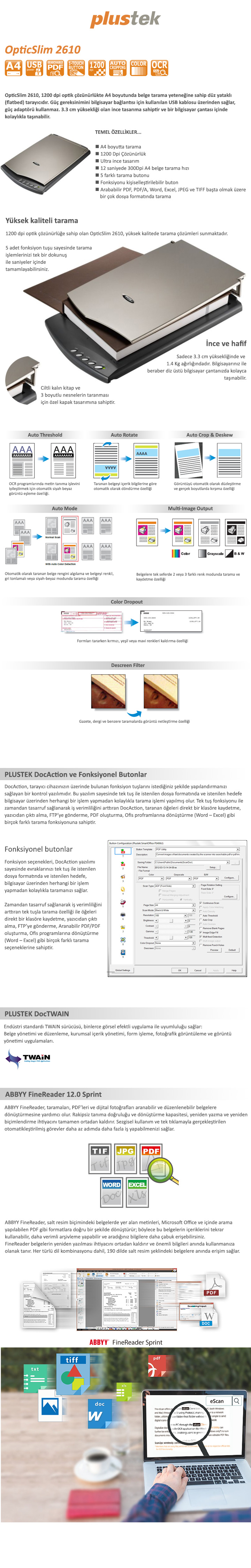 Plustek OpticSlim 2610, 12 saniyede 300Dpi ile A4 boyutlu belge tarama özelliğine sahip düz yataklı (flatbed) tarayıcıdır. Ultra ince tasarımı sayesinde dizüstü bilgisayar çantasında kolaylıkla taşınabilir. Güç gereksinimini bilgisayarın ile arasındaki USB iletişim kablosu üzerinden alır ve bir adaptöre ihtiyaç duymaz. Fonksiyonları düzenlenebilir akıllı tarama butonları, beraberinde gelen güçlü doküman düzenleme yazılımları ve ekonomik maliyeti ile küçük ofis ve ev kullanıcıları için kaliteli tarama çözümleri sunar.