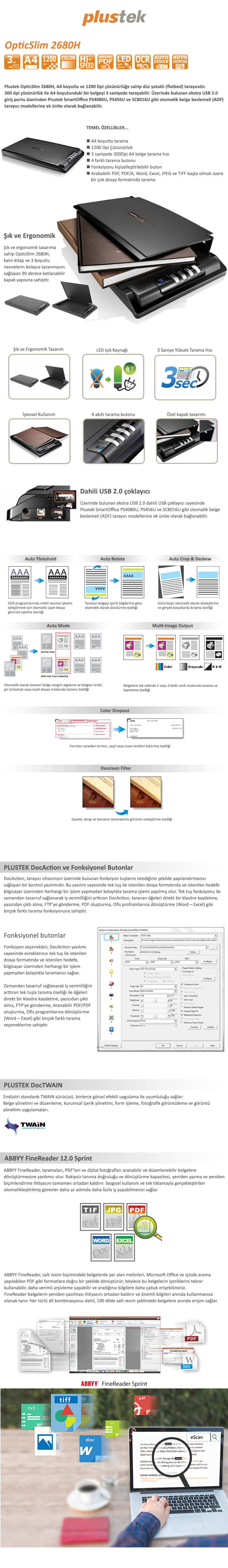 Plustek OpticSlim 2680H, 3 saniyede 300Dpi ile A4 boyutlu belge tarama özelliğine sahip hızlı bir düz yataklı (flatbed) tarayıcıdır. Şık ve ergonomik tasarıma sahip olan OpticSlim 2680H üzerinde otomatik belge beslemeli (ADF) tarayıcılara ek modül olarak bağlanabilmesi için bir adet USB 2.0 çoklayıcı porta sahiptir. 1200dpi çözünürlüğü, düzenlenebilir akıllı tarama butonları ve beraberinde gelen güçlü doküman düzenleme yazılımları ile kullanıcılarına kaliteli tarama çözümleri sunar.